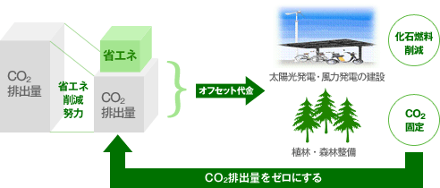 地球温暖化を防止する目的で、日常生活等で排出されるカーボン(二酸化炭素:CO2)をオフセット(別の場所で減らす)することです。
