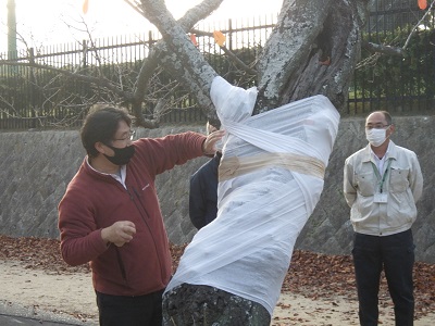 近隣府県では、クビアカツヤカミキリの侵入及び果樹や街路樹などへの被害が確認されており、兵庫県内への侵入リスクも高まってきています。発生が確認された場合に備えて、現場で早急に対処するための技術的な手法について研修を行いました。